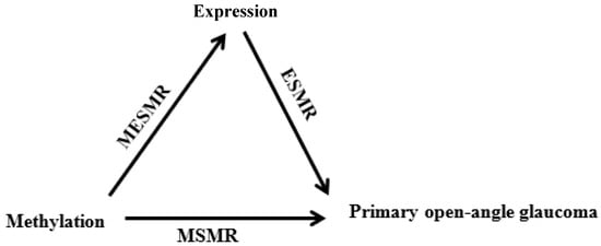 DNA: deoxyribonucleic acid; POAG: primary open-angle glaucoma; GWAS: Genome-wide association study; eQTL: expression quantitative trait loci; SMR: summary-data-based Mendelian randomization; mQTL: methylation quantitative trait loci; MSMR: SMR analysis of GWAS vs. mQTL; MESMR: SMR analysis of mQTL vs. eQTL; and ESMR: SMR analysis of GWAS vs. eQTL.