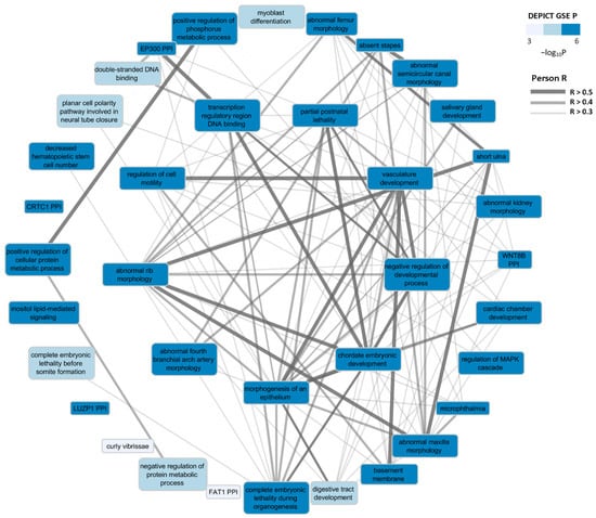 GeneMANIA functional enrichment analysis revealed 246 significantly enriched gene ontology (GO) terms for 142 prioritized genes (Supplementary Table S3A). Sensitivity analysis in the 34 genes with two or more lines of evidence yielded 174 significantly enriched GO terms (Supplementary Table S3B). Along with several closely related pathways, most of the most significant GO terms were related to the extracellular matrix (ECM) (GO:0031012, q = 6.95 × 10−56), transforming growth factor-β (GO:0007179, q = 4.20 × 10−11), cardiovascular traits (e.g., blood vessel development, GO:0001568, q-value=2.40 × 10−7), heart development (GO:0007507, q = 2.52 × 10−6), Wnt signaling (GO:0016055, q = 2.52 × 10−6), retinoic acid receptor binding (GO:0042974, q = 1.18 × 10−4), and eye development (GO:001654, q = 3.09 × 10−3; Supplementary Table S3A,B). Several of these pathways, including heart development, regulation of protein phosphorylation, embryo development, and Wnt-protein signaling, were in line with the most prioritized terms from DEPICT. Similarly, IPA identified 64 canonical signaling pathways (Supplementary Table S3C). Based on the high percentage of focus molecules in our datasets, RAR activation (p = 1.32 × 10−5), leptin signaling (p = 7.94 × 10−4), and aryl hydrocarbon receptor signaling (p = 1.09 × 10−3) were the most strongly enriched canonical signaling pathways constructed in IPA.
