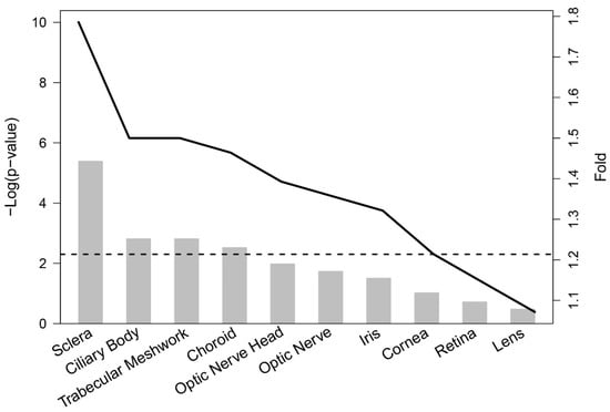 Bar graph showing enrichment in ten ocular tissues of 112 available prioritized genes (out of the total of 142) amongst the genes in the ocular tissue database with gene expression values in the top 25%. Bars show the significance of overrepresentation (y-axis left), dashed horizontal line running through the bars is the threshold for p-value < 0.005 (adjusted for multiple testing), and the solid black line shows the fold of overrepresentation (y-axis right).