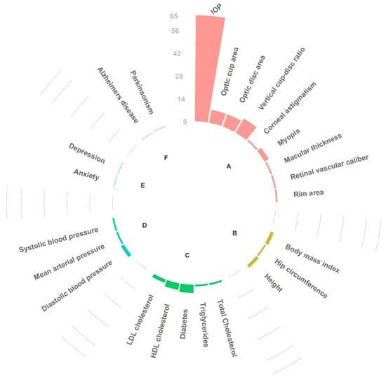 Circular barplot: each bar shows the number of linked SNPs (LD r2 > 0.80) having pleiotropic effects between POAG-associated loci and six phenotypic categories. A: optic parameters and other eye problems; B: anthropometry-related traits; C: lipids and type 2 diabetes; D: blood pressure; E: psychiatric disorders; F: neurodegenerative disorders.