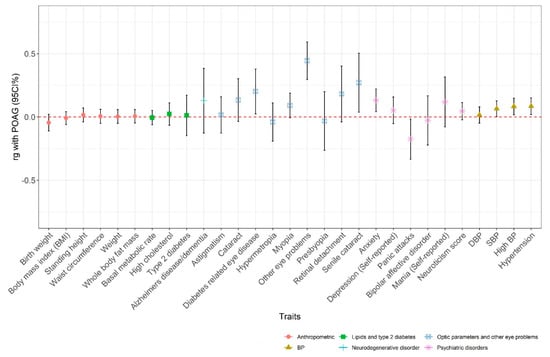 Dot and whisker plot: the genetic correlations and 95% confidence intervals between POAG and six phenotypic categories were calculated using the LD score regression method.