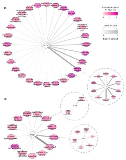 Correlation of BICC1 (A) AFAP1 (B) with DEPICT reconstituted gene sets. Ovals represent gene set clusters. Edges represent correlation Z-score which for gene set clusters is the sum of correlation with their individual gene sets. Detailed correlation of genes with individual gene sets (circles) within clusters is shown as subnetworks.