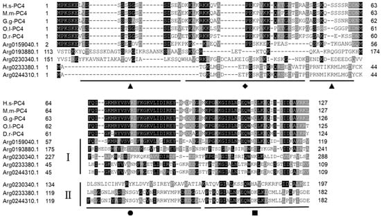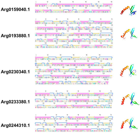 Although the sequences structure of AiPC4s showed some differences, several evolutionarily conserved domains were found in AiPC4 proteins by the SMART analysis. Apparently, all five AiPC4s shared a functionally conserved PC4 domain, with only one in Arg0159040.1 and Arg0193880.1, whereas two in Arg0230340.1, Arg0233380.1 and Arg0244310.1 (Figure 2). Besides, a low complexity region (Lcr) existed in Arg0159040.1 and Arg0230340.1, and another zf-PARP domain was found in Arg0193880.1 and Arg0230340.1. What is more, the deduced secondary structures analysis of AiPC4s showed that these proteins consisted of 8, 18 15, 9 and 8 α helixes; 4, 23, 17, 12 and 14 β strands; 8, 25, 13, 12 and 11 coils; 7, 28, 20, 15 and 18 turns, respectively (Table 1 and Figure 3). The tertiary structures of AiPC4s were regular foldings of the polypeptide chain and are shown in Figure 3, displaying that they shared similar protein conformational structures. Specifically, according to our analysis of the multiple sequence alignment, the AiPC4s were highly conserved at the key sites of the ssDNA-binding region (black circle) and the dimerization region (black square), while the serine-rich domain (black triangle) and lysine-rich domain (black diamond) were relatively less conserved (Figure 4).