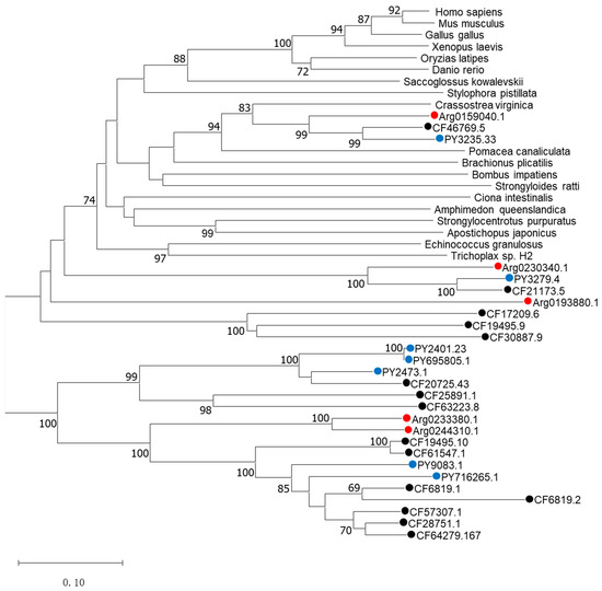 The phylogenetic tree was constructed based on the protein sequences of AiPC4s and PC4s from other species. Numbers at the tree nodes indicate the bootstrap values from 1500 replicates. AiPC4s and PC4s from C. farreri and P. yessoensis are represented by red, black and blue circles, respectively. Accession numbers of other species’ PC4s are listed in the Table S1.
