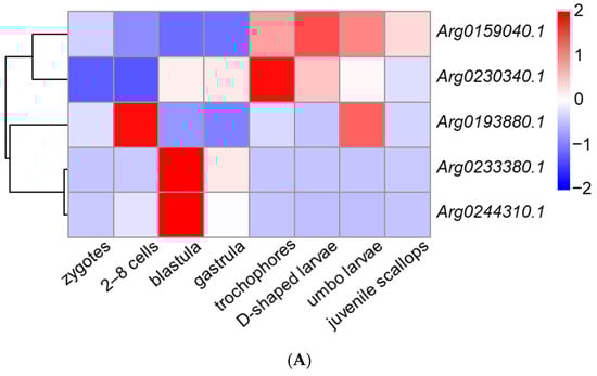 We obtained the spatiotemporal expression profiles of AiPC4s through RNA-seq data generated from embryos/larvae at eight developmental stages (zygotes, 2–8 cells, blastula, gastrula, trochophores, D-shaped larvae, umbo larvae and juvenile scallops) and eight kinds of adult tissues (hepatopancreas, foot, mantles, gills, gonads, kidney, smooth muscle and striated muscle). As shown in Figure 6A, the five AiPC4s presented different expression patterns from zygotes to juvenile scallops. The expression level of Arg0159040.1 was the highest in embryos/larvae at nearly all detected developmental stages (the average expressions of Arg0159040.1 were 2.14 to 68.89-fold compared with those of the other AiPC4s in embryos/larvae at developmental stages). In detail, Arg0159040.1 expressed relatively low levels in embryos/larvae at early developmental stages, but initially rose from trochophores (2.17-fold) and reached the highest in D-shaped larvae (2.80-fold), then gradually decreased from umbo larvae (2.37-fold) to juvenile scallops (1.71-fold). As for Arg0230340.1, the expression level showed an increasing trend from zygotes (1.00-fold) to gastrula (10.16-fold) and reached the highest in trochophores (20.39-fold) but decreased from D-shaped larvae (11.96-fold) to juvenile scallops (7.46-fold). Arg0193880.1 mainly expressed in 2–8 cells (3.31-fold) and umbo larvae (2.66-fold), and the expression of which could be observed in embryos/larvae at other developmental stages with lower levels in zygotes, blastula (0.41-fold), gastrula (0.21-fold), trochophores (0.98-fold), D-shaped larvae (0.79-fold) and juvenile scallops (0.95-fold), respectively. Arg0233380.1 and Arg0244310.1 displayed a similar expression pattern during all the developmental stages, with maximum expressions in blastula (106.37-fold and 36.56-fold, respectively), and followed by a moderate expression trend in the other developmental stages (0.95~24.33-fold and 0.00~5.89-fold, respectively).