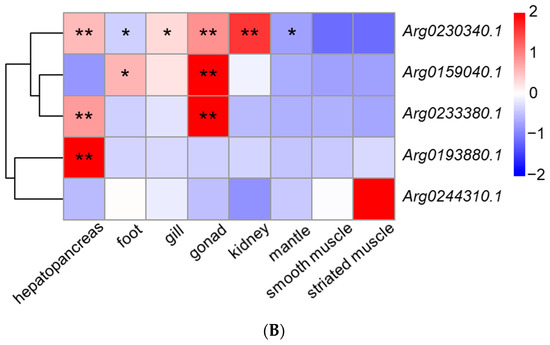The spatiotemporal expression profiles of AiPC4s in eight kinds of adult tissues (the hepatopancreas, foot, mantles, gills, gonads, kidney, smooth muscle and striated muscle) of healthy bay scallops were determined and shown in Figure 6B. Generally, different expression profiles of AiPC4s were presented in eight kinds of adult tissues. Wherein, Arg0159040.1 presented the highest expression level in each healthy adult tissue (the expressions of Arg0159040.1 were 6.59 to 119.57-fold compared with the total expressions of the other AiPC4s in each sampled tissue), which was similar to its expression profiles in embryos/larvae at eight developmental stages. The expression level of Arg0159040.1 ranged from 0.92 to 2.97-fold in tissues compared with that in smooth muscle, with the highest expression level in gonads (2.97-fold, p < 0.01) and the lowest expression level in hepatopancreas (0.92-fold). Significant (p < 0.05) or extremely significant (p < 0.01) higher levels of Arg0230340.1 were observed in hepatopancreas (122.56-fold), foot (56.38-fold), gill (103.09-fold), gonad (144.48-fold), kidney (193.54-fold) and mantle (30.47-fold) compared with that in smooth muscle. As for Arg0233380.1, the expression level reached its peak in gonads (44.06-fold, p < 0.01), followed by hepatopancreas (23.07-fold, p < 0.01) and other tissues (0.28 to 7.35-fold). In addition, Arg0193880.1 showed a tissue-specific pattern, with an observing elevated level in hepatopancreas (53.76-fold, p < 0.01) in comparison with those in other tissues (0.00 to 2.81-fold). A similar tissue-specific higher expression of Arg0244310.1 was also displayed in striated muscle (3.73-fold), and slight/no expression (0.00 to 1.05-fold) of which could be detected in all kinds of adult tissues. The five AiPC4s showed different expression patterns but were principally higher expressed in the tissues of hepatopancreas, foot, gonad and kidney. The spatiotemporal expression profiles of AiPC4s suggested the functions of these genes in embryos/larvae at developmental stages and healthy adult tissues in bay scallops.