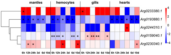 Expression profiles of AiPC4s were determined in different tissues (mantles, gills, hemocytes and hearts) being processed under 32 °C at different times (0 h, 6 h, 12 h, 24 h, 3 d, 6 d and 10 d) for investigating their expression regulations with heat stress (Figure 7). Generally, all AiPC4s displayed diverse expression regulation patterns in different tissues in 32 °C, including up- and down-regulations at different time points, showing obvious tissue-specific and time-dependent patterns. In mantles and hemocytes, the expression pattern of each AiPC4 was similar at different challenging time points. Specifically, no expression of Arg0233380.1 could be detected at group C, but it was obviously (p < 0.05) up-regulated at 6 h in mantles (1808.10-fold). Arg0230340.1 showed obviously (p < 0.05) time-dependent up-regulations in mantles and hemocytes after high-temperature stimulation, including 12 (2.52-fold) and 24 h (2.35-fold) in mantles and 24 h (13.18-fold) and 10 d (12.26-fold) in hemocytes. Conversely, Arg0193880.1 was obviously (p < 0.05) down-regulated at most time points in mantles and hemocytes (0.00-, 0.00-, 0.19-, 0.17- and 0.21-fold and 0.00-, 0.12-, 0.24-, 0.00- and 0.00-fold at 6 h, 12 h, 24 h, 3 d and 6 d in mantles and hemocytes, respectively). Arg0244310.1 was generally down-regulated at most challenging time points in mantles and hemocytes (0.22-, 0.00-, 0.00-, 0.76-, 0.60- and 0.00-fold and 0.00-, 0.15-, 0.28-, 0.53-, 0.16- and 0.67-fold at 6 h, 12 h, 24 h, 3 d, 6 d and 10 d in mantles and hemocytes, respectively). Significant (p < 0.05) or extremely significant (p < 0.01) expression levels of Arg0159040.1 were down-regulated at multiple time points with high temperature stimulation in hemocytes (0.56-, 0.58-, 0.62-, 0.58- and 0.65-fold at 6 h, 12 h, 24 h, 6 d and 10 d, respectively), but this trend was not obvious in the mantles. In gills, an up-regulation of Arg0233380.1 could be observed at acute 6 h (3,311.56-fold, p < 0.05) among the up-regulated expression profile. In addition, the expression regulation pattern of Arg0159040.1 in gills was extremely special compared with that in other tissues: (1) Arg0159040.1 showed an up-regulation-dominated expression pattern in gills, which was distinct with those in other tissues (down-regulation-dominated expression patterns); (2) the up-regulated expression profile of Arg0159040.1 was time-dependent, with significant (p < 0.05) or extremely significant (p < 0.01) up-regulations in acute (1.82- and 2.69-fold for 12 and 24 h) and chronic (2.21- and 1.98-fold for 3 and 10 d) periods. Diverse expression regulation patterns of Arg0193880.1 and Arg0230340.1 in gills could be observed compared with those in mantles and hemocytes, without significant up-regulation or down-regulation reactions. In hearts, Arg0244310.1 and Arg0230340.1 both displayed a single time-point-dependent up-regulation, with significantly (p < 0.05) up-regulated levels in 3 d (316.16-fold) and 10 d (2.82-fold), respectively. Damagingly down-regulated expressions of Arg0193880.1 were observed at all high-temperature stimulation time points with a consistent trend of that in mantles and hemocytes. Arg0233380.1 and Arg0159040.1 presented up-regulation and down-regulation reactions at different time points with high-temperature stimulation (0.87-, 0.92- 1.01-, 1.22-, 0.72- and 0.91-fold and 0.10-, 2.23-, 0.69-, 1.43- and 0.91-fold at 6 h, 12 h, 24 h, 3 d, 6 d and 10d). On the whole, down-regulations mainly occurred in Arg0193880.1 and Arg0244310.1, while the other three AiPC4s showed mixed (up- or down-) regulations with tissue-specific and/or time-dependent expressions. Overall, all AiPC4s were differentially expressed at one or several time points post-challenge and showed tissue-specific and/or time-dependent expression patterns with function allocation with thermal stress.