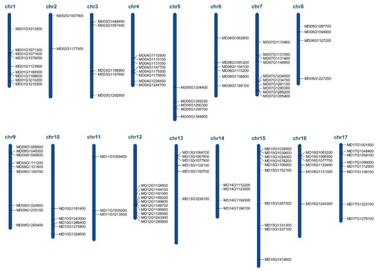 We downloaded the distribution information of all the 113 MdWRKY sequences from the apple genome database, and displayed their physical sites on different chromosomes using MapChart software. The results showed that 110 out of the 113 sequences were distributed on the 17 chromosomes of apple, while the other three failed to anchor on any chromosome, including MD00G1140800, MD00G1143500 and MD00G1143600. Chromosome 7 had the most numbers of WRKYs, there were ten of them. Chromosome 2 had the least numbers of WRKYs, only two (Figure 1).