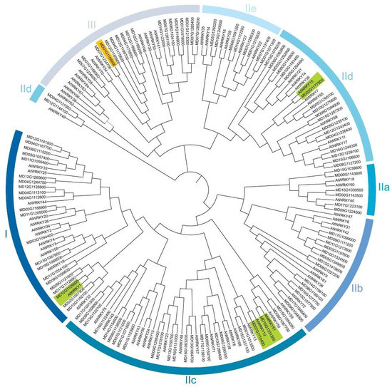 Phylogenetic tree of identified MdWRKY and AtWRKY proteins. Phylogenetic tree was constructed using MEGA-X program with the neighbor-joining (NJ) method. WRKY genes in each subgroup were shown with different colored arc. There were 71 AtWRKYs used in the figure and the sequence was downloaded from TAIR. The terminal branches of the phylogenetic tree connected an AtWRKY and an MdWRKY were marked with green. MdWRKY70L (MD01G1168600) was marked with orange.