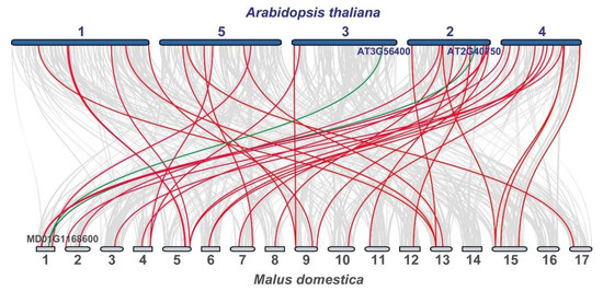 Synteny analysis of WRKY genes between Arabidopsis and Malus domestica. Syntenic WRKY genes of Arabidopsis (A. thaliana) and apple (M. domestica) are exhibited with red lines. Gray lines indicate the synteny blocks. The green lines indicate the synteny of MdWRKY70L (MD01G1168600) and AtWRKYs (AT3G56400 and AT2G40750).