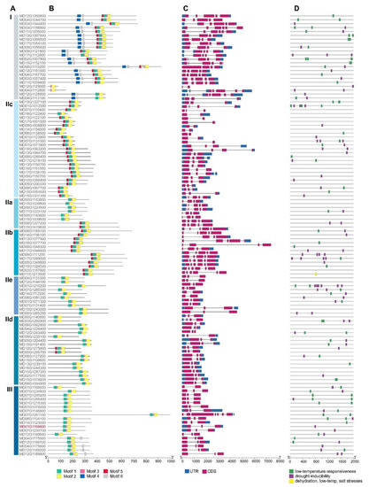 Phylogenetic tree, protein motif, gene structure and cis-acting element analysis of MdWRKY genes. (A) Phylogenetic tree. Phylogenetic tree was constructed using MEGA-X program with the neighbor-joining (NJ) method; (B) Protein motifs. The conserved motifs were identified by MEME. Each motif was represented by a colored box, the sequence information for each motif is provided in supplementary Table S3; (C) Gene structures. Data in GFF3 format was downloaded from JGI and analyzed using TBtools. CDS, UTR and intron are represented by pink mauve box, dark blue box and grey line, respectively; (D) Cis-acting element prediction. Cis-element prediction was performed using PlantCARE. Only those related to stresses were selected for visualization and the rest were not displayed. The visualization of the results was achieved using TBtools. MdWRKY70L (MD01G1168600) are marked with red.