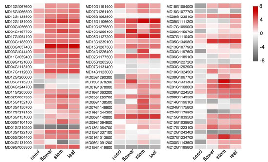 Most WRKY members in Figure 5 expressed highly in the detected tissues, including seed, flower, stem and leaf. For example, MD15G1106600, MD03G1057400, MD00G1140800 and MD08G1127200 expressed highly in the four tissues. There were also some members whose expression levels were obviously lower than others in the four tissues, for example, MD01G1210200, MD15G1419600, and Md12G1243400. Among all the detected MdWRKYs, MD08G1127200 was highly expressed in the seed. The expression of MD03G1057400 was highest in the flower and the leaf. The expression of MD15G1106600 was highest in the stem. MdWRKY70L (MD01G1168600) also expressed highly in the four tissues, and the highest expression was observed in the stem and the lowest expression was observed in the seed, implying that it may also be involved in plant growth and development (Figure 5).