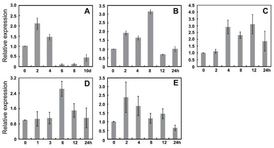 The expression pattern of MdWRKY70L under different stress treatments. (A) Drought stress treatment; (B) ABA treatment; (C) Salt stress treatment; (D) Alkali stress treatment; (E) Low temperature treatment. MdMDH was used as the internal reference and the expression data on 0 h or 0 d were normalized to “1”. The error bars indicate the standard deviation between four replicates.