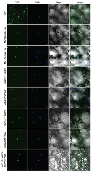 To investigate the subcellular localization of MdWRKYs, several members were recombined with GFP protein to construct MdWRKYs-GFP fusion proteins, and transiently expressed in the leaves of tobacco (N. benthamiana). The GFP fluorescence in tobacco leaves was observed using a confocal laser scanning microscope, and all the fusion proteins were observed in the nuclei, while the GFP protein was detected both in the nuclei and in the cytoplasm (Figure 7), suggesting that the seven MdWRKYs we selected were localized in the cell nucleus, including MdWRKY70L.