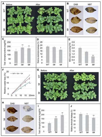 Five-week-old potted tobacco seedlings were used for the salt and drought stress treatments. For inducing drought stress, we stopped watering tobacco plants for 10 days. The seedlings were irrigated with 200 mM NaCl solution to induce salt stress. Phenotypes before and after the stress treatments were photographed and preserved. Samples were collected to determine the physiological indicators. Chlorophyll and the relative electrolyte leakage (REL) were determined according to Dong et al. (2020) [30]. Malondialdehyde (MDA) levels were measured by the barbiturate method using an MDA test kit (Nanjing Jiancheng, Nanjing, China). The relative water loss was measured according to Gong et al. (2015) [28], as well as the DAB and NBT staining. The stress treatments were performed with at least three biological replicates with identical plant numbers in each replicate.