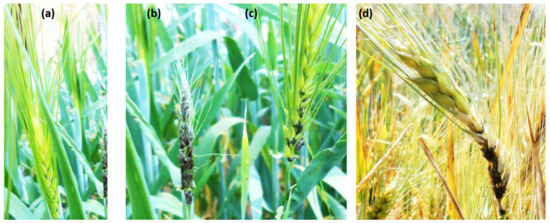Barley (Hordeum vulgare L.) is one of the most important cereal grains grown in temperate climates. It has been used for animal feed (as a grain or as fodder) and human nutrition (as a component of various foods). During its life cycle, barley suffers from many biotic and abiotic stresses which affect its yield. Loose smut (LS) (caused by the basidiomycete pathogen Ustilago nuda (Jens.) Rostr. (U. nuda)) is one of these important diseases. This disease has been reported in 1.3–11.7% of fields in Egypt [1], 50–70% of fields in Western Canada [2], and it is also common in the Great Plains of the United States [3]. Certified barley seed is highly recommended to be treated with fungicide to prevent this disease. During grain development, the smutted (diseased) heads disperse spores by wind or rain to healthy heads. After harvest, the infected seeds with LS appear normal. However, in the next season, after germination, the fungus will infect and grow within the plant and replace the head with spores at the flowering time [4]. A reduction in yield is directly associated with the percentage of infected tillers. Climate change is expected to increase the pathogen spread by increasing temperatures, changing precipitation patterns, changing extreme weather events, and reducing water availability [5]. Therefore, the chances of agriculture crops encountering both biotic and/or abiotic stresses are expected to be more frequent than in the past. This change will result in a significant deterioration in staple crops such as barley and wheat (Triticum aestivum L.).