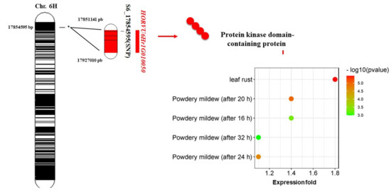 Of all significant SNPs identified, one SNP on chromosome 6H is located within a gene model of HORVU3Hr1G002060. This gene encodes a protein kinase domain-containing protein. Protein kinase domains can be divided into two phosphorylating groups, phosphorylating either serine/threonine or tyrosine residues on target proteins [44]. Serine/threonine protein kinases have been associated with plant disease resistance pathways [41]. Such proteins have previously been associated with resistance to powdery mildew (Blumeria graminis f. sp. tritici) in wheat [41], stem rust resistance in barley [42], bacterial blight disease resistance in rice [12], and stripe rust resistance in wheat [43]. HORVU6Hr1G010050 was found to be highly expressed 1.8-fold under stem rust resistance compared to the control (Figure 4, Supplementary Table S4). Moreover, it also had a higher expression under powdery mildew than under control. Therefore, the S6_17854595 located on the 6H chromosome could be very useful to target the HORVU6Hr1G010050 gene. The result of gene annotation of this SNP supports the power of genetic association performed in this study in detecting putative SNP associated with loose smut resistance. A KASP marker targeting this SNP can be designed and used for validation in other genetic backgrounds before using it for marker-assisted selection to improve resistance to LS in barley. The expression of the other candidate gene models did not associate with disease resistance.