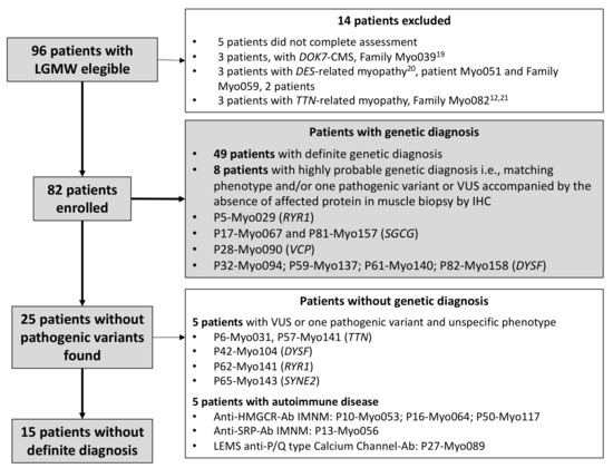 Ninety-six patients were eligible for enrolment, eighty-two of whom were eventually included and completed this HTS study protocol (Figure 1). The 14 cases excluded corresponded to 5 patients that did not fully complete the required assessments; one family, comprising 3 affected individuals, was diagnosed with a DOK7-related CMS [18]; 3 additional patients were affected with desminopathy, which initiated their genetic study on a single-gene approach independently, earlier to the inception of this study [19]; another 3-member family that was affected with titinopathy studied through a different NGS protocol [12,20]. A detailed description of the ancillary testing findings was not the objective of this report, but it is discussed when phenotypic information is relevant to determine a variant’s pathogenicity (i.e., protein expression in muscle biopsy) (Supplementary Materials Table S1).