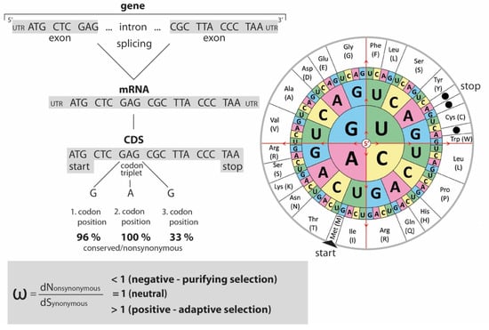 Gene structure, conservation, and DNA to amino acid translation. Exons (including terminal UTR) and introns are assembled to form genes (regulatory regions are not shown). After the splicing of introns, mRNA triplets forming the CDS are translated into amino acids according to the amino acid code (right; codon wheel from 123RF.com, 24366216, accessed on 10 June 2022). The impact of a point mutation in a codon depends on its position. Totals of 96%, 100%, and 33% of changes at the first, second, and third codon positions, respectively, result in amino acid changes (nonsynonymous changes dN) as opposed to synonymous changes (dS), which do not affect the amino acid sequences/protein translation. A dN/dS ratio (omega ⍵) of 1 indicates the neutral evolution of the protein. Values lower than 1 suggest negative purifying selection and above 1 positive or adaptive selection.