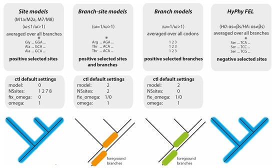 A commonly used tool to determine dN/dS ratios and therefore selection pressure on multiple orthologous protein-coding sequence regions (evolving from the same ancestors) during phylogenetic comparisons is the Phylogenetic Analysis by Maximum Likelihood (PAML) suite (version 4.9j []). The integrated codeml analysis evaluates various hypotheses by comparing nested statistical models via likelihood ratio tests (LRTs). Of specific interest for selection analysis are (1) the site models for detecting sites under positive selection, (2) branch-site models for detecting branches and sites under positive selection, and (3) branch models for detecting branches under positive selection as embedded in PAML. For the phylogenetic scope and additional details of the tests, see Figure 2. None of the three can detect negative selection.