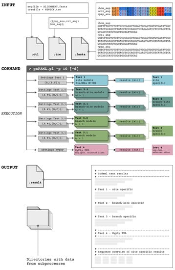 The basic concept of our Perl command-line tool paPAML is to run different modules of codeml and HyPhy FEL in parallel processes, which minimizes the administrating time and to maximize the visibility of phylogenetic branches and codon positions that were exposed to natural selection. That is accomplished by simultaneously running independent codeml calculations of all automatically labelled individual tree topologies (foreground labelled by, e.g., one #1 mark per tree topology) for the branch-site and branch-specific tests. This enables shorter total runtimes, especially on large multicore computer systems, without changing the basic algorithms of either codeml or HyPhy FEL. paPAML enables user-defined settings of the upper limit of parallel runs allowing for optimal adaptation to the computational environment. Furthermore, paPAML reduces preparation time for large datasets by automatically specifying ctl configuration files for each test (default or entered command line parameters) and tree/tre-files and coordinates to run all subsets of tests. According to codeml requirements, the outgroup species must be placed as the first sequence in the alignment. Because PAML automatically removes positions with gaps in alignments and HyPhy treats such positions as ambiguous bases by default instead, prior manual removal of all such gap positions is necessary to apply codeml and HyPhy based on the same alignment. Correspondingly, the positions of detected positively or negatively selected sites relate directly to the modified alignment of the reference species (first sequence) and require a subsequent realigning to the original genes of individual species. Furthermore, stop codons need to be removed. The tree must be in Newick format. Figure 3 illustrates the input and output formats, an example command, and the parallelization concept. All example data are presented in Supplementary Data S1.