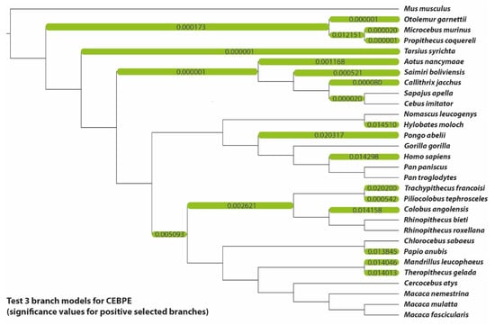 Neither the site model nor the branch-site model detected sites under positive selection in the CEBPE gene. Instead, 68 of the 281 codons were subject to purifying selection according to the HyPhy FEL algorithm, which did not detect any positively selected sites. The branch model, on the other hand, found 22 out of 50 branches with signals of positive selection, including the branch leading to H. sapiens. This may indicate that while the gene is primarily subject to strong purifying selection and is most likely highly conserved, it was also regularly the focus of episodic positive selection during its phylogenetic history (Figure 5). Note that sites under positive selection could be identifiable by expanding the analyzed species spectrum to other representatives of mammals or vertebrates.