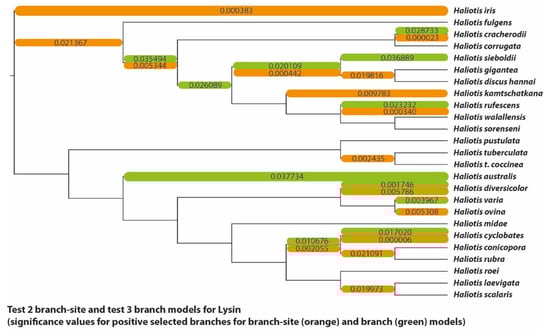 (3) The classical example for positive adaptive selection—the abalone sperm lysin gene. The dataset consisted of orthologous lysin sequences with a length of 360 base pairs from 25 species of the sea snail genus Haliotidae (abalones) []. The paPAML analysis of the lysin dataset finished in approximately 115 min. By comparison, the longest-running codeml test (the branch-site model comparison) took almost 405 min to complete. If the models were used consecutively, the overall run of all the model comparisons in codeml would have taken about 14.5 h. Ubiquitous signals of positive selection on multiple branches as well as negative selection on several sites were found in the lysin example dataset. All significantly supported positive selection pressures on branches are shown in Figure 6. The site model showed a remarkably high fit of the positive selection model to the dataset (p < 0.000001 for both M1a/M2a and M7/M8) as well as 17 of 120 sites under significant positive selection, although codon 114 was only detected with the M7/M8 model comparison. The HyPhy FEL algorithm found an overlap with positively selected sites and that codons 24, 32, 75, 114, and 120 (Supplementary Table S1) were positively selected. On the other hand, it also found codons 33, 63, 94, 111, 115, and 119 (Supplementary Table S1) to be under positive selection, which the site model did not confirm. Such differences between the models are to be expected due to their different methods of calculating selection pressures. The branch model detected 11 out of 47 branches to be under significant positive selection with ω values averaged over sites. By comparison, the branch-site model detected specific sites under selection in 9 branches. They were not, however, entirely overlapping, with the branch leading to Haliotis varia and the one to H. siboldii found to be positively selected only by the branch model. Additionally, the branch-site model detected positively selected sites in the branch leading to H. kamtschatkana and three others that were not found to be under significant positive selection pressure by the branch model. This was also expected, as the branch model searches for selection signals by averaging ω-values over sites, while the branch-site model allows sites to have different ω -values. About 26 codons were also found to be under positive selection pressure only in specific branches (for example, codon 15 in the branch leading to H. kamtschatkana). Lastly, the HyPhy FEL algorithm revealed 15 codons under purifying selection (Supplementary Table S1). Interestingly, one of them, codon 45, seems to be under positive selection in the branch leading to H. cyclobates. Because this codon is otherwise highly conserved, averaged over the entire phylogeny this might indicate a potentially adaptive change unique to the species, which might have been missed without the added contrast of the detection of negatively selected sites.