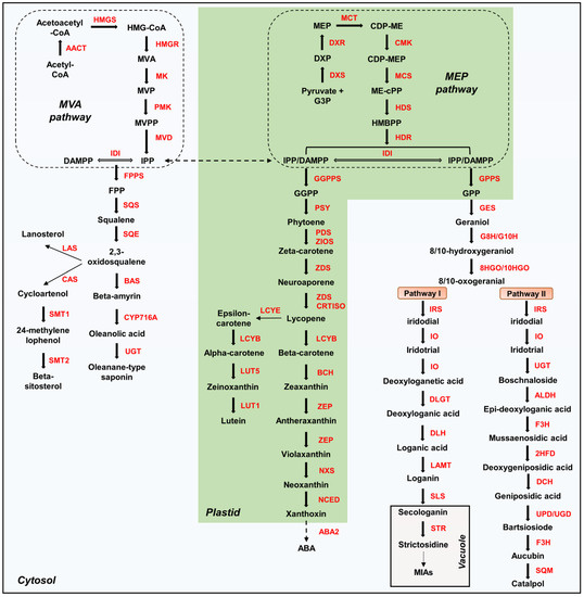 Terpenoid metabolism in plants. HMG, 3-hydroxy-3-methylglutaryl; MVA, mevalonate; MVP, mevalonate phosphate; MVPP, mevalonate diphosphate; IPP, isopentenyl pyrophosphate; DAMPP, dimethylallyl pyrophosphate; G3P, glyceraldehyde 3-phosphate; DXP, 1-deoxy-D-xylulose 5-phosphate; MEP, methylerythritol 4-phosphate; CDP-ME, 4-(cytidine 5′-diphospho)-2-C-methyl-D-erythritol; ME-cPP, 2-C-methyl-D-erythritol-2,4-cyclodiphosphate; HMBPP, 1-hydroxyl-2-methyl-2-butenyl-4 diphosphate; FPP, farnesyl diphosphate; GGPP, geranylgeranyl diphosphate; GPP, geranyl diphosphate; TIAs, terpenoid indole alkaloids; ABA, abscisic acid; AACT, acetyl-CoA acetyltransferase; HMGS, hydroxymethylglutaryl-CoA synthase; HMGR, 3-hydroxy-3-methylglutaryl-CoA reductase; MK, mevalonate kinase; PMK, phosphomevalonate kinase; MVD, mevalonate diphosphate decarboxylase; DXS, 1-deoxy-D-xylulose 5-phosphate synthase; DXR, 1-deoxy-D-xylulose 5-phosphate reductoisomerase; MCT, 2-C-methyl-D-erythritol 4-phosphate cytidylyltransferase; CMK, 4-diphosphocytidyl-2-c-methyl-d-erythritol kinase; MCS, 2-C-methyl-D-erythritol 2,4-cyclodiphosphate synthase; HDS, 4-hydroxy-3-methylbut-2-enyl diphosphate synthase; HDR, 4-hydroxy-3-methylbut-2-enyl diphosphate reductase; IDI, isopentenyl-diphosphate delta-isomerase; FPPS, farnesyl pyrophosphate synthase; SQS, squalene synthase; SQE, squalene epoxidase; BAS, beta-amyrin synthase; CYP716A, beta-amyrin oxidase; UGT, UDP-glycosyltransferase; LAS, lanosterol synthase; CAS, cycloartenol synthase; SMT1, sterol 24-C-methyltransferase; SMT2, 24-methylenesterol C-methyltransferase; GGPPS, geranylgeranyl pyrophosphate synthase; GPPS, geranyl pyrophosphate synthase; GES, geraniol synthase; G8H/G10H, geraniol 8/10-hydroxylase; 8HGO/10HGO, 8/10-hydroxygeraniol dehydrogenase; IRS, iridoid synthase; IO, irodoid oxidase; DLGT, deoxyloganetic acid glucosyltransferase; DLH, deoxyloganic acid hydroxylase; LAMT, loganic acid O-methyltransferase; SLS, secologanin synthase; STR, strictosidine synthase; ALDH, aldehyde dehydrogenase; F3H, flavanone 3-hydroxylase; 2HFD, 2-hydroxyisoflavanone dehydratase; DCH, deacetoxycephalosporin-C hydroxylase; UPD, uroporphyrinogen decarboxylase; UGD, UDP-glucuronic acid decarboxylase; SQM, squalene monooxygenase; PSY, phytoene synthase; PDS, phytoene desaturase, ZIOS, 15-cis-zeta-carotene isomerase; ZDS, zeta-carotene desaturase; CRTISO, carotenoid isomerase; LCYB, lycopene beta-cyclase; LCYE, lycopene epsilon cyclase; BCH, beta-carotene 3-hydroxylase; LUT5; lutein deficient 5; LUT1, lutein deficient 1; ZEP, zeaxanthin epoxidase; NCED, nine-cis-epoxycarotenoid dioxygenase; ABA2, xanthoxin dehydrogenase.
