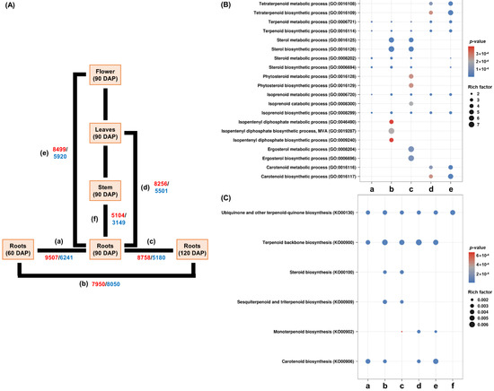 Analysis of GO and KEGG pathways. (A) Schematic diagram of DEG analysis. DEG analysis between roots’ development and other tissues using six comparative combinations: (a) 60 DAP roots vs. 90 DAP roots; (b) 60 DAP roots vs. 120 DAP roots; (c) 90 DAP roots vs. 120 DAP roots; (d) 90 DAP roots vs. 90 DAP leaves; (e) 90 DAP roots vs. 90 DAP flowers; and (f) 90 DAP roots vs. 90 DAP stems. Red and blue numbers indicate up- and down-regulated DEGs, respectively. (B,C) The analysis of terpenoid-related GO and KEGG terms using dot plot. The color of the circles represents the p-value between each comparison. The size of the circles indicates the DEGs ratio assigned to the GO or KEGG terms/all genes assigned to those GO or KEGG terms, respectively. DEGs, differentially expressed genes; GO, gene ontology; KEGG, Kyoto Encyclopedia of Genes and Genomes.