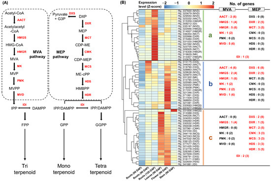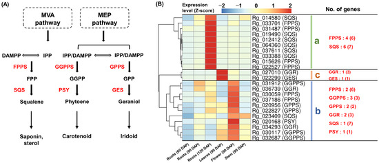 Expression analysis of genes involved in MVA and MEP biosynthesis. (A) MVA and MEP biosynthetic pathway in plants. (B) Heatmap analysis of MVA and MEP biosynthetic genes. (a) Genes cluster showing a strong expression in the 120 DAP roots. (b) Genes cluster showing a constitutive expression in most tissues. (c) Genes cluster showing a strong expression in the leaves and flowers at 90 DAP. Genes highlighted in red indicate genes assigned to each cluster and the number in parentheses is the total number of genes encoding the enzyme expressed in R. glutinosa transcriptome. MVA, mevalonate phosphate; MEP, methylerythritol 4-phosphate.