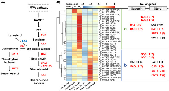 Cluster-a primarily contained the genes that were strongly expressed in 120 DAP roots. Three BAS-encoding genes and five BAO/CYP716A-encoding genes involved in saponin biosynthesis were included in this group, along with six SQS-encoding genes and one SQE-encoding gene (Figure 5B(a)).