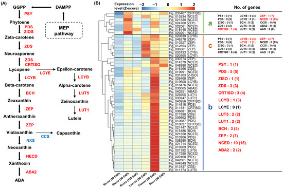 Genes encoding PDS, ZISO, ZDS, CRTISO, LCYB, LUT5, LUT5, BCH, ZEP, NCED, and ABA2 were co-expressed in 90 DAG flowers along with genes encoding PSY (Figure 6B(b)). Moreover, the high expression of one LCYE- and two LCYB-encoding genes was confirmed in 90 DAP leaves and flowers (Figure 6B(c)).