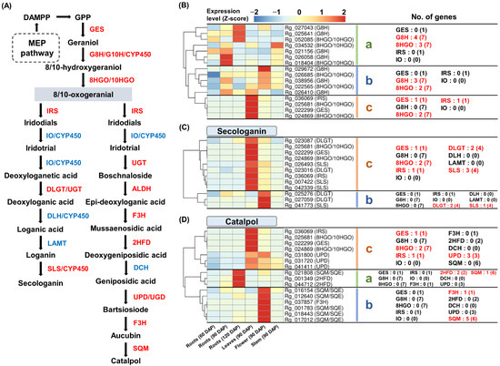 Expression analysis of two iridoids biosynthesis genes. (A) Secologanin and catalpol biosynthetic pathway in plants. Genes that were missing in this study and genes with <5 TPM values are shown in blue. (B–D) Heatmap analysis of genes involved in two iridoid pathways. (a) Genes cluster showing a high expression in the roots. (b) Genes cluster showing a strong expression in the 90 DAP flowers. (c) Genes cluster showing a strong expression in the 90 DAP leaves. Genes highlighted in red indicate genes assigned to each cluster and the number in parentheses is the total number of genes encoding the enzyme expressed in R. glutinosa transcriptome. TPM, transcripts per million.