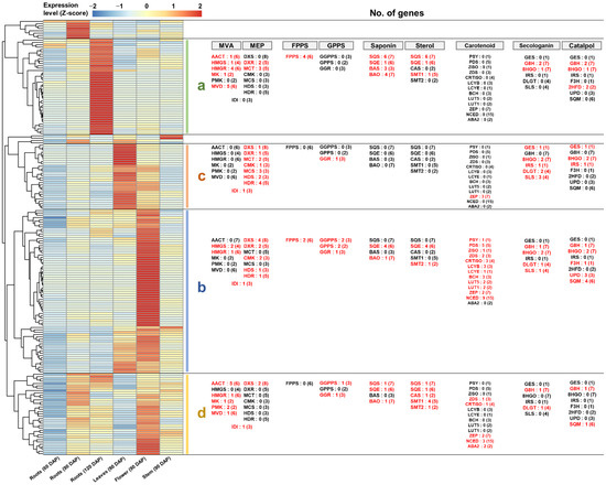 We systematically investigated the expression of a large number of genes involved in specific terpenoid biosynthesis, including the MVA and MEP pathways. The co-expression of these genes may suggest a functional link for specific terpenoid biosynthesis. Therefore, the integrated co-expression analysis was performed using 186 genes selected from the previous results. These genes were classified into four groups based on their expression patterns (Figure 8 and Table S15).