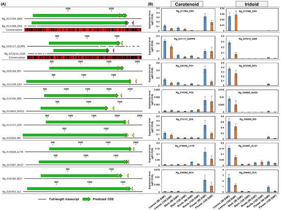 qRT-PCR analysis of carotenoid and iridoid biosynthesis genes via MEP pathway. (A) Schematic diagram of the nucleotide sequence structure of genes involved in carotenoid and iridoid biosynthesis. Colored arrows indicate specific primer positions for the amplification of each gene. Red regions in conservation boxes indicate identical sequences between homologous genes. (B) qRT-PCR analysis. The real expression level of each gene was calculated using the delta-CT method and visualized using a bar plot. Error bars represent standard deviations (SD) among three replicates. MEP, methylerythritol 4-phosphate.