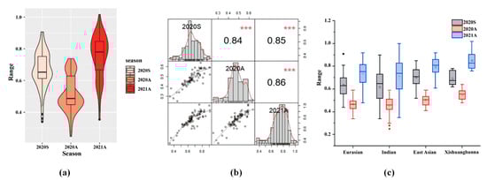The cucumber stem diameters of 88 cucumber CG lines were measured in Spring 2020, Autumn 2020 and Autumn 2021,respectively. The stem diameter in different seasons all showed a continuous normal distribution, which suggests that the cucumber stem diameter is controlled by polygenes. The cucumber stem diameters in three seasons range from 0.34 to 0.91, 0.25 to 0.74 and 0.35 to 1.02, with the mean of 0.66, 0.48 and 0.76, respectively. The overall diameter of cucumber stem in Autumn 2021 was larger, which may be due to the later developmental stage of plants when phenotyped. The coefficients of variation of stem diameter in the three seasons were 17.32%, 15.10% and 16.08%, respectively (Table 1). The correlation of stem diameter in the three seasons was between 0.84 and 0.86, showing a highly significant correlation (p < 0.001) (Figure 1a,b). Moreover, the 88 CG lines were divided into four ecotypes [], including the East Asian type (33 CG lines), the Eurasian type (20 CG lines), the Indian type (19 CG lines), and the Xishuangbanna type (8 CG lines); it was found that the stem of East Asian cucumber was thicker than that of European and Indian cucumber. However, it was difficult to group the Xishuangbanna type cucumber since only eight CG lines were included (Table S3; Figure 1c).