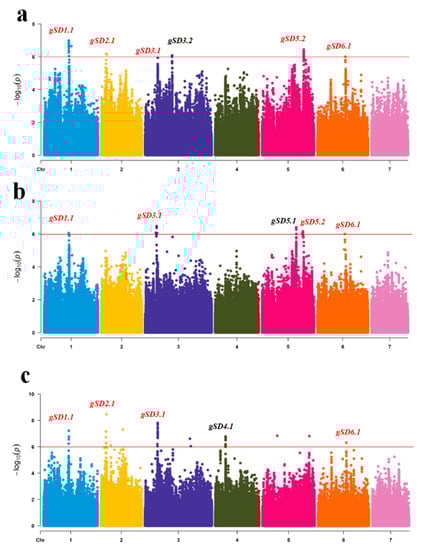 Genome-wide association study (GWAS) analysis of cucumber stem diameter in (a) 2020S; (b) 2020A; (c) 2021A. Manhattan plots of the cucumber stem diameter in three seasons. The red line represents a significant threshold of GWAS (−log10p)= 6). The red font indicates repeatedly detected loci.