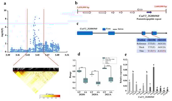 For locus gSD2.1, the candidate region (Chr.2: 3400–3490 kb) was analyzed by pairwise LD correlations, and we focused on the region from 3,430,000 bp to 3,460,000 bp in the LD block (Figure 5a). Seven candidate genes located in this region were CsaV3_2G006900, CsaV3_2G006910, CsaV3_2G006920, CsaV3_2G006930, CsaV3_2G006940, CsaV3_2G006950, and CsaV3_2G006960 (Figure 5b). Only the SNP on CsaV3_2G006960 showed significant differences in 15 thick and 13 thin stems. Among thick and thin stem lines, 10 out of the 15 thick lines carried the GGCAAGATGCGG haplotype, whereas 7 of the 13 thin stem lines carried the CTTGGAGAAGAA haplotype. The SNPs in the region resulted in two amino acid changes, which were located in CDS (Figure 5c,d). Gene annotation revealed that CsaV3_2G006960 is pentatricopeptide repeat. Its homolog in Arabidopsis, AT1G09190, is a class of superfamily proteins associated with TPR related to mitochondrial RNA processing. Moreover, on analyzing the gene expression pattern, the expression of CasV3_2G006960 was highest in CG25, and those of the other five thick stem samples (CG9, CG26, CG39, CG94, CG107) were much lower than that of CG25. CG45 had the lowest gene expression compared to the other five thin stem samples (CG1, CG14, CG37, CG49, CG86).