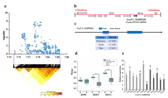For locus gSD3.1, a candidate region (chr3: 7740–7830 kb) was analyzed by LD correlation analysis, and we focused on the region from 7,745,000–7,830,000 bp in the LD block; 11 candidate genes were located in this region (Figure 6a). Only the SNP on CsaV3_3G009560 showed significant differences between 15 thick and 13 thin stems haplotypes in Autumn 2020 and Autumn 2021 (Figure 6b). A total of seven SNP occurred in CsaV3_3G009560, including the 6th SNP in the CDS region, resulting in non-synonymous mutations in one amino acid. Among thick and thin stem lines, 9 out of the 15 thick lines carried the TTGAGCC haplotype, whereas 11 of the 13 thin stem lines carried the CAATATA haplotype (Figure 6c,d). Gene annotation showed that CsaV3_3G009560 is a LITTLE ZIPPER protein. Its homolog in Arabidopsis AT2G45450 interacts with the HD-Zip protein to form a heterodimer, which directly affects the activity of stem tip tissue and the abnormality of stem cells []. According to gene expression pattern analysis, the expression of CsaV3_3G009560 was higher in thin stem samples (CG1, CG14, CG37, CG45, CG49, CG86) than that of the thick stem samples (CG9, CG26, CG94, CG107) (Figure 6e).