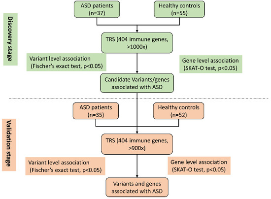 As shown in Figure 1, the study was conducted in two stages: the discovery stage and the validation stage. In the discovery stage, 37 patients with ASD and 55 healthy controls were recruited. targeted region sequencing was performed using our previously designed panel of 404 immune-response-molecule genes. The target region size was approximately 500 Kbp, the average coverage depth was >1000×, and the 10× coverage rate was >99%. A total of 7526 point mutations were detected, 285 of which differed significantly between the ASD and the healthy control groups (p value less than 0.05, Fisher’s exact test, Supplementary Table S1). During the validation stage, 35 patients with ASD and 52 healthy controls were enrolled. Statistical analysis showed that 231 mutations were significantly different between the ASD and healthy control groups (p value less than 0.05, Fisher’s exact test, Supplementary Table S2).