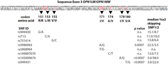 Four of seven exon 3 SNPs differ significantly in exon skipping The nucleotide sequence of OPN1LW/OPN1MW exon 3 is given. The eight polymorphic nucleotides analyzed in this study are shown in red letters using the IUB code where R is A or G, M is A or C, S is G or C, K is G or T, and Y is T or C. Black triangles underscore the codons containing the SNPs and the codon numbers are indicated. More information about each SNP can be found at in dbSNP (https://www.ncbi.nlm.nih.gov/snp/, accessed on 1 February 2022). Below the codon numbers are the two alternate amino acids encoded, below which are the two common nucleotides at each SNP. At each position, the amino acid and nucleotides are given as allele 1/allele 2. For example, codon 151 is either AGG or AGA, designated G/A. Both of these codons encode arginine, designated R/R using the single-letter amino acid code. Codon 153 is either CTG or ATG, designated C/A, and encodes leucine or methionine, respectively, designated L/M (see Table 1 for the single letter amino acid code). SNP ID numbers in the left-most column are from dbSNP151 for the OPN1LW gene. The median percentage of exon-3 skipping for each SNP except the third nucleotide of codon 171 (labeled n.a. for not applicable) is in the right-most column. A slash (/) separates values for alleles 1 and 2. After adjusting for multiple comparisons by applying the Bonferroni correction, three of the SNPs were significantly associated with exon-3 skipping (n.s. indicates adjusted p-value was not significant).