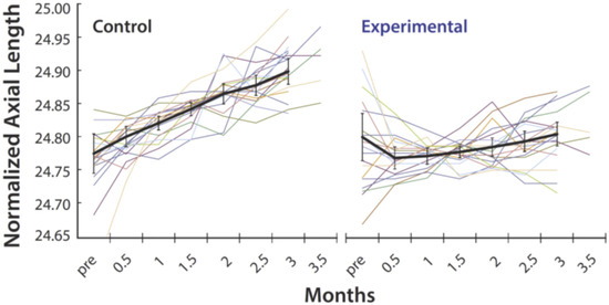 The association between high myopia and exon skipping in the Xq28 opsin genes led us to propose the unorthodox hypothesis that increased contrast signaling is the common pathway in myopia development and progression. We tested the theory by measuring the effect of reducing retinal contrast on axial elongation in children with progressive myopia. To maximize statistical power and minimize sample size, each participant wore an experimental lens on one eye and a control lens on the other eye. Both lenses were standard-of-care single-vision lenses. The experimental lens had a red-light blocking tint and light scattering elements that spread incident light over a 0.5-degree angle, reducing contrast and the relative activity difference between adjacent cones that results from visual experience. The best-corrected acuities of participants ranged from 20/15 to 20/20 without light scattering and 20/20 to 20/25 with light scattering. The control lens had a neutral tint, so both eyes experienced the same luminance, removing it as a variable. Participants were in the early stages of rapidly progressing myopia (Table S1), documented by a change in refractive error of at least −1.0 D during the previous year. Thirteen subjects wore the experimental lens on their dominant eye and the control lens on the non-dominant eye. After 3 months, seven participants re-enrolled for another 3 months, during which they wore the experimental lens on the non-dominant eye and the control lens on the dominant eye. Supplementary Table S2 lists the baseline characteristics of participants. The primary outcome measure was the change in axial length from baseline for the eye wearing the experimental lens versus the control lens over 3 months. As predicted by the contrast theory of myopia, Figure 2 shows that there was a dramatic reduction in the average axial length growth rate in the eyes wearing the experimental lens (0.063 ± 0.33 µm/day; mean ± SE), versus control (1.43 ± 0.24 µm/day), and the difference was highly statistically significant (p = 0.0019). The growth rate of the control eyes in this study is larger than that reported for studies involving more children and lasting 1 to 3 years [39]. This is due to our inclusion criteria requiring very fast progressing myopes and the short duration of our study.