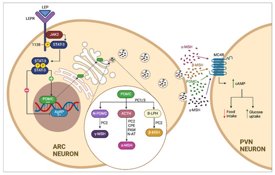 Classical leptin–melanocortin pathway. The melanocortin pathway is regulated by the production of leptin (LEP) and its receptor (LEPR) present in neurons of the arcuate nucleus of the hypothalamus. LEP induces the expression of proopiomelanocortin (POMC) by activating the JAK-STAT pathway, which is transported by cellular cisterns and degraded by specific enzymes present in the cell, including prohormone convertase 1 (PCSK1, PC1/3), which promotes the formation of α and β melanocyte-stimulating hormones (α/β-MSH) and which are recognized by the melanocortin 4 receptor (MC4R) present in neurons of the paraventricular nucleus of the hypothalamus, which induces the sensation of satiety and increased energy use.