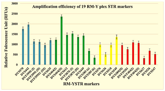 Optimization of the multiplex was achieved by varying the primer concentrations (0.31 µM–0.65 µM) in a final reaction volume of 8 µL (Supplementary Figure S2). Sensitivity studies were performed to determine the lowest amount of DNA required to generate a complete DNA profile. Serial dilutions of 2800 M (2.0 ng, 1.0 ng, 0.5 ng, 0.25 ng, 0.125 ng and 0.05 ng) revealed a gradual decrease in the peak intensity (RFU) with a decrease in the concentration, as shown in Supplementary Figure S3. Full profiles were successfully obtained down to 0.125 ng; however, further decreases in the concentration lead to allele dropout for DYS627 and DYS547, and the peak heights for DYS526b and DYS385 were reduced to <100 RFU. Amplification efficiency studies based on ten runs of 9948 standard DNA showed consistent results, as illustrated in Figure 1.