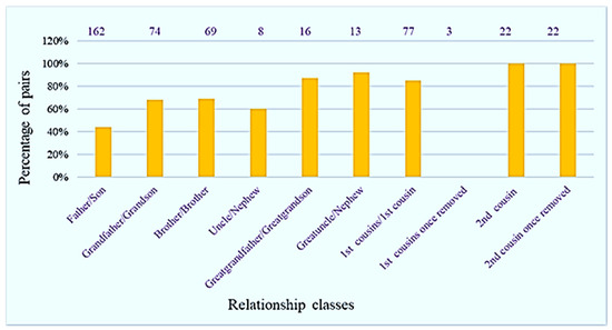Pairs of male paternal relatives (n = 536) separated by one to seven meiosis with at least one mutation. Values above the bars represent the total number of pairs for each relationship class.