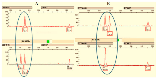 A total of 19 loci comprising 12 core RM-YSTRs: DYF399S1, DYF387S1, DYF404S1, DYS526 (b), DYS449, DYS518, DYS547, DYS570, DYS576, DYS612, DYS626 and DYS627, along with 7 additional markers: DYS442, DYS635, DYS464, DYS389 (II), DYF393S1, DYS385 and DYS549, were chosen based on their high mutation rates, as published in other populations [1,15,16,17]. All sets of markers chosen in this study, along with their primer sequences and their fragment sizes, are given in Supplementary Table S1. Reference sequences for the primer design were accessed from the NCBI “available online: https://www.ncbi.nlm.nih.gov/ (accessed on 4 January 2019)” and all primer sequences were designed using web-based software Primer3 v4.0, “available online: http://bioinfo.ut.ee/primer3-0.4.0/ (accessed on 4 January 2019)”. Forward primer sequences were labeled with a florescent dye compatible with the matrix standards, and all primers were synthesized by ThermoFisher Scientific.