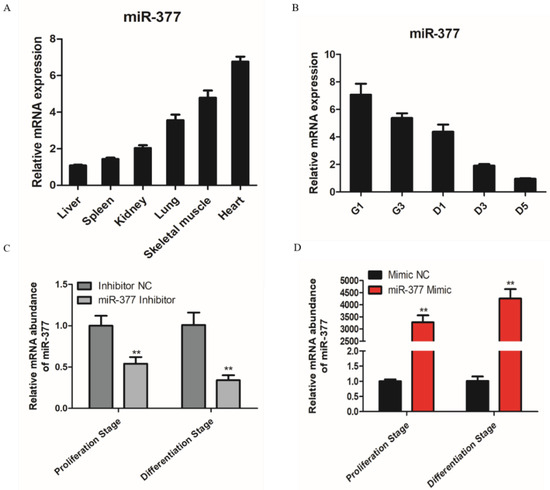 Expression pattern of miR-377 in bovine. (A) Expression levels of miR-377 in bovine heart, liver, spleen, lung, kidney and skeletal muscle. (B) Expression levels of miR-377 in SMSCs cultured in either GM for 1d and 3d (G1 and G3) or in DM for 1, 3 and 5d (D1, D3 and D5). (C) The expression levels of miR-377 in bovine SMSCs transfected with inhibitor NC and miR-377 inhibitor. (D) The expression levels of miR-377 in bovine SMSCs transfected with Mimic NC and miR-377 Mimic. Data are expressed as mean ± SEM (n = 3). ** p < 0.01.
