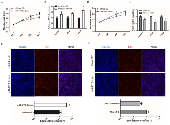 To investigate the effect of miR-377 on the proliferation of bovine SMSCs, we detected the proliferation status of bovine SMSCs through quantitative Real-time PCR (qPCR), 5-Ethynyl-20-deoxyuridine (EdU) and Cell Counting Kit-8 (CCK8) assays. CCK8 assay found that the proliferation of SMSC cells increased significantly in miR-377 silenced cells (Figure 2A). The cells transfected with miR-377 inhibitor had greater expression levels of CyclinD1, CDK2 and PCNA mRNA than those negatively transfected with the inhibitor (Figure 2B). EDU assay also found that cell proliferation significantly increased in those transfected with miR-377 inhibitor SMSCs (Figure 2C). We achieved mir-377 overexpression with the transfected cell with the miR-377 mimics. However, we found that miR-377 overexpression significantly inhibited the proliferation of bovine SMSCs (Figure 2D–F). Together, these results manifest that miR-377 restrains the proliferation of bovine SMSCs.