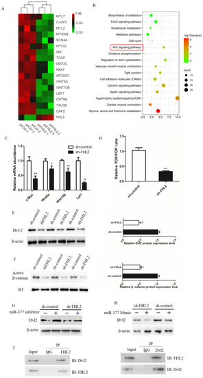 miR-377 negatively regulates Wnt/β-catenin signaling pathway by mediating Dvl-2. (A) Grading clustering and heat map of gene expression levels associated with marker myogenesis in SMSCs transfected with control or FHL2 shRNA. (B) Enrichment analysis of pathways with significantly differentially expressed genes in sh-ctrl and FHL2 silenced cells. (C) Relative mRNA expression levels of c-Myc, Wnt5a, Wnt10b and Lef1 in FHL2 silenced and sh-control cells. (D) Luciferase activity of TOP/FOP in control and FHL2 silenced cells. (E) Western blot analysis Dvl-2 protein levels in FHL2 silenced and sh-control cells. (F) Western blot analysis of β-catenin protein expression in the nucleus of sh-control or FHL2 silenced cell. (G) Western blot analysis Dvl2 protein expression levels in FHL2 silenced and sh-control cells treated with miR-377 inhibitor for 24 h. (H) Western blot analysis of Dvl2 protein expression levels in FHL2 silenced and control cells treated with miR-377 Mimic for 24 h. (I) Co-immunoprecipitation analysis of FHL2 and Dvl2 after SMSCs were cultured in differentiation medium for 72 h. Data are expressed as mean ± SEM (n = 3). * p < 0.05; ** p < 0.01.