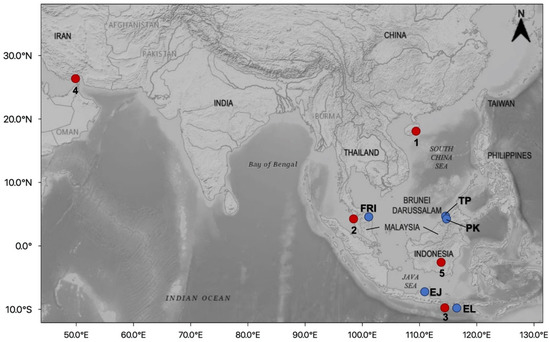 Map showing the collection sites of P. arugamensis in Brunei Darussalam, Peninsular Malaysia and Indonesia. Blue circles indicate the sampling locations: FRI: Fisheries Research Institute, TP: Tanjong Pelumpong, PK: Pulau Kaingaran, EJ: Lamongan, East Java, Surabaya and EL: Ekas Bay, East Lombok, West-Nusa Tenggara. Red circles indicate mtDNA COI GenBank sequences: 1. Hainan (China), 2. Penang (Peninsular Malaysia), 3. Bali (Indonesia), 4. Bandar Khamir (Iran), 5. Borneo (specific location is unavailable). Base map is downloaded from the USGS National Map Viewer (open access) at http://viewer.nationalmap.gov/viewer/ (accessed on 14 August 2021).